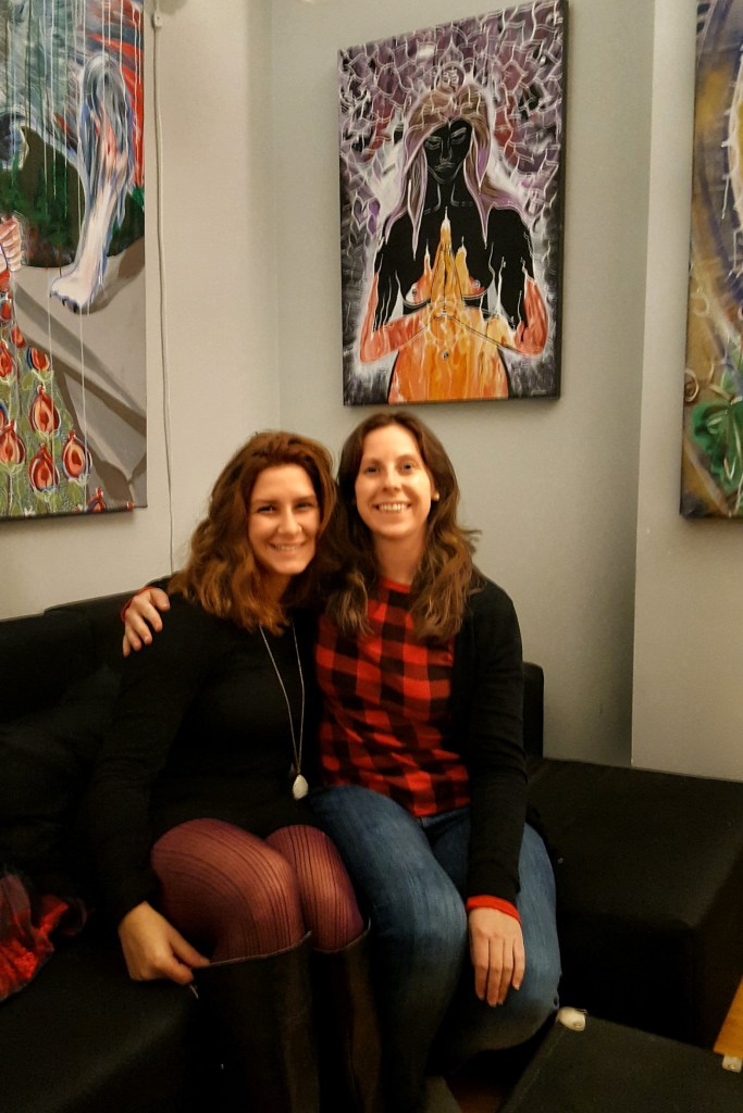 Each canvas that hung on the wall told a story and exuded the emotion and trauma of the artist. One large canvas that hung boldly on the wall, exhibited semi-frantic lines and patterns in bright colors flashing across the background. Smooth, calm patterns wove in and out of the lines. A hint of a silhouette peaks out amongst the lines, patterns and vibrant colors. Finished shortly after her grandfather’s passing, Lindsey used this painting to honor him and address her trauma of losing one of the most important people in her life. She reminisced on his support of her artist endeavors and the emotional roller coaster of losing him. “ That was a tough one to get through,” she nervously giggled. The slightly hidden silhouette resembled the grandfather that she missed. “I feel that he is watching over me and that is a representation of that. He was my biggest supporter. I went through a lot losing him. You can kinda see that in this piece. It took a while and a lot of emotion to get through it.” A thoughtful silence hung in the air as another painting caught my eye, provoking me to ask the inspiration and interpretation. The human anatomical figure on one side and the figures of a wolf and a bear other other seemed to be provoking each other from different sides of the canvas. The human body in conflict with the natural surrounds or a deeper evil. “That image came to me in a dream!” She smiled. We discussed the symbolism and laughed at my rudimentary interpretation of her art, as Lindsey walked over to the closet and began to pull out a few smaller works.